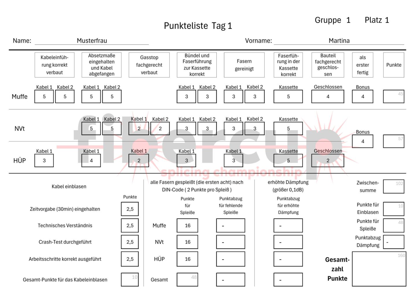 • Nach erfolgter bidirektionaler OTDR- Messung durch den Veranstalter, wird eine unmittelbare Beurteilung der Ergebnisse nach den festgelegten Regeln durchgeführt. Die einzelnen Teilnehmer*innen des Slots werden durch Schiedsrichter über die erzielten Punkte und die Gesamtpunktzahl informiert.